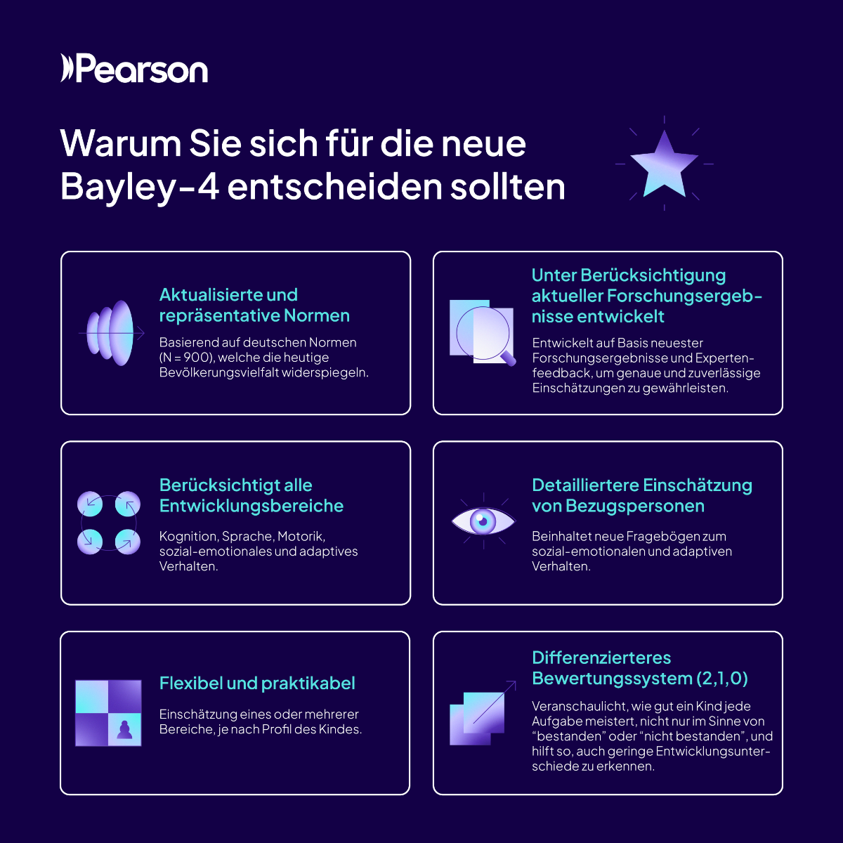 • ermöglicht erste Einschätzung, ob das Risiko einer Entwicklungsverzögerung oder -störung besteht, ohne dass die Bayley-4 Langform durchgeführt werden muss